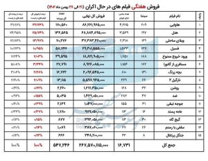 فروش سینمای ایران از ۲۱ تا ۲۷ بهمن بدون احتساب فروش جشنواره فیلم فجر به بیش از ۲۶ میلیارد و ۷۵۷ میلیون تومان رسید؛ همچنین در این هفته ۵۴۷ هزار و ۲۴۶ نفر به تماشای فیلمهای اکران شده پرداختند.