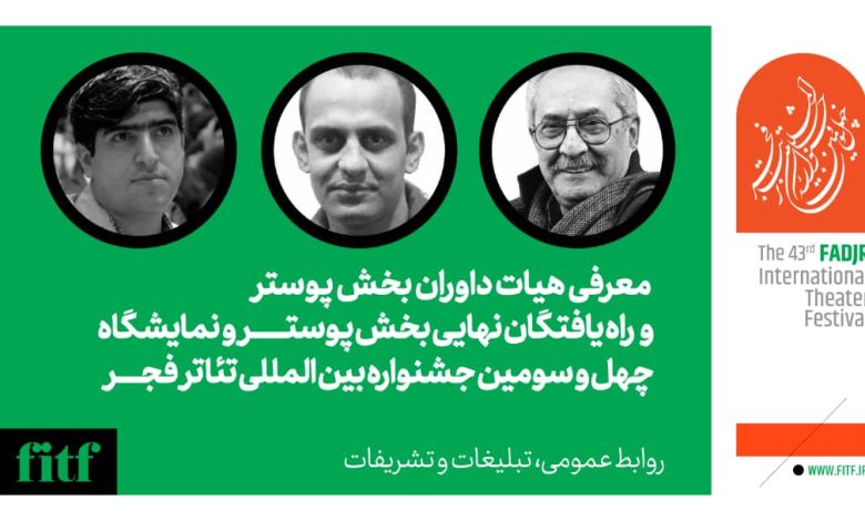 ابراهیم حقیقی، جواد آتشباری و بهراد جوانبخت داوری بخش پوستر جشنواره بینالمللی تئاتر فجر را برعهده دارند که پس از بررسی نهایی آثار رسیده به دبیرخانه چهل و سومین جشنواره بینالمللی تئاتر فجر، آثار رسیده از ۲۰ هنرمند را برای حضور در بخش نهایی انتخاب کردند.