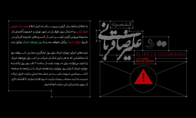 به گزارش روزنه هنر، به دلیل اعلام هشدار نارنجی هواشناسی و احتمال بروز طوفان در شهر تهران و به ویژه فضای باز مجموعه ورزشی آزادی، اولین شب از کنسرتهای علیرضا قربانی در تاریخ چهارم خرداد ۱۴۰۴ برگزار نخواهد شد و به روز نوزدهم خرداد موکول میشود.