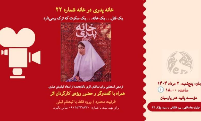 فیلم سینمایی «خانه پدری» ساخته کیانوش عیاری در خانه شماره ۲۲ نمایش داده می شود.